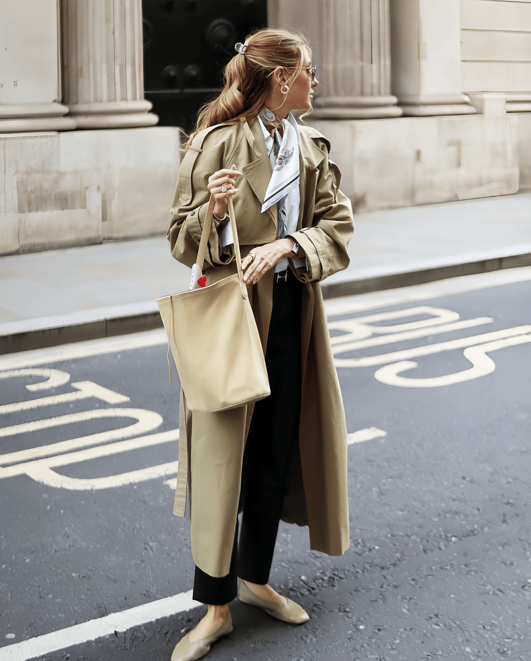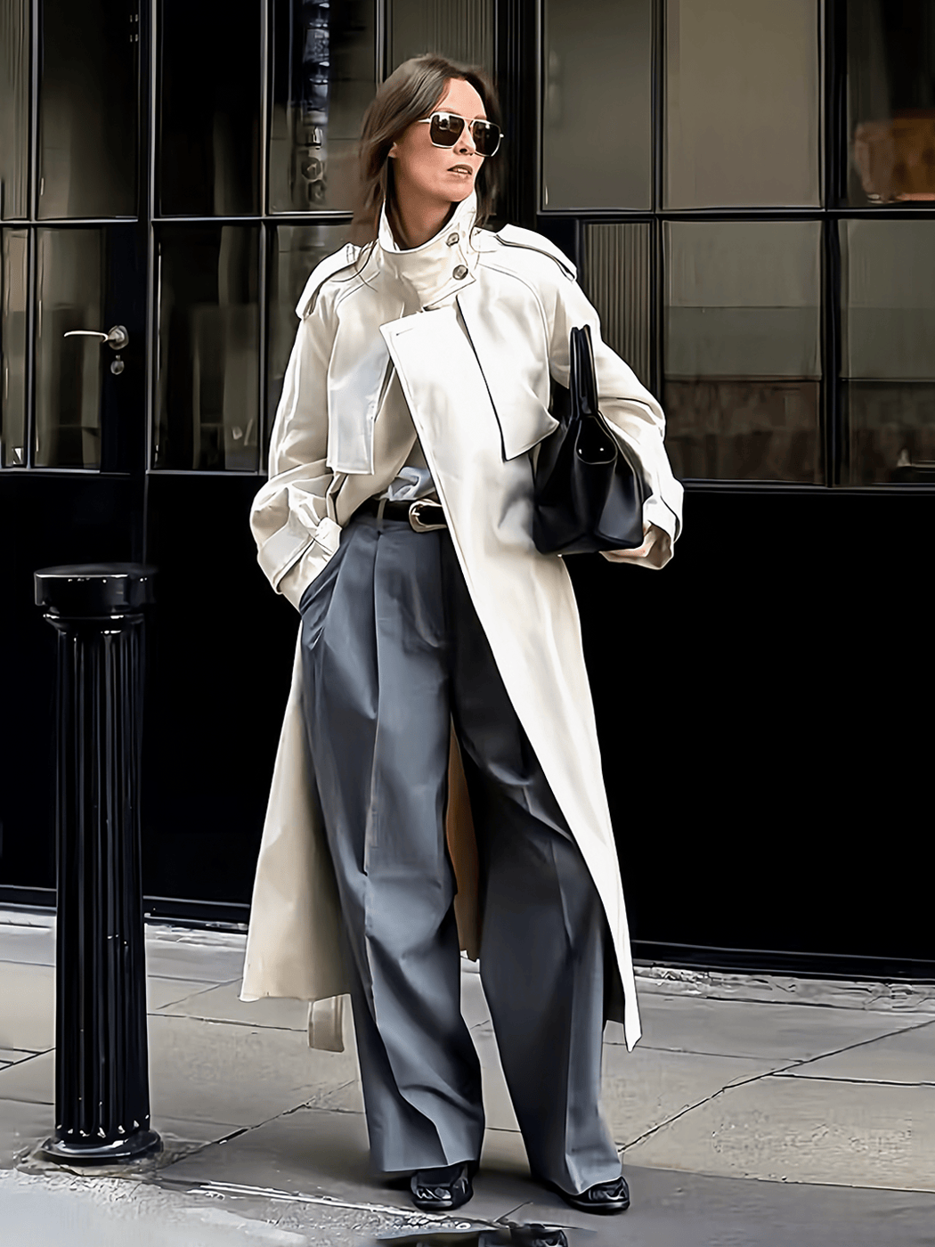 想穿出利落職場風,直接襯衫+西褲+風衣,幹練又瀟灑。