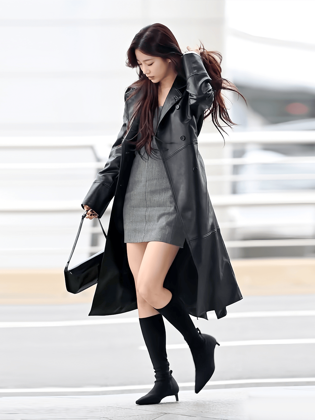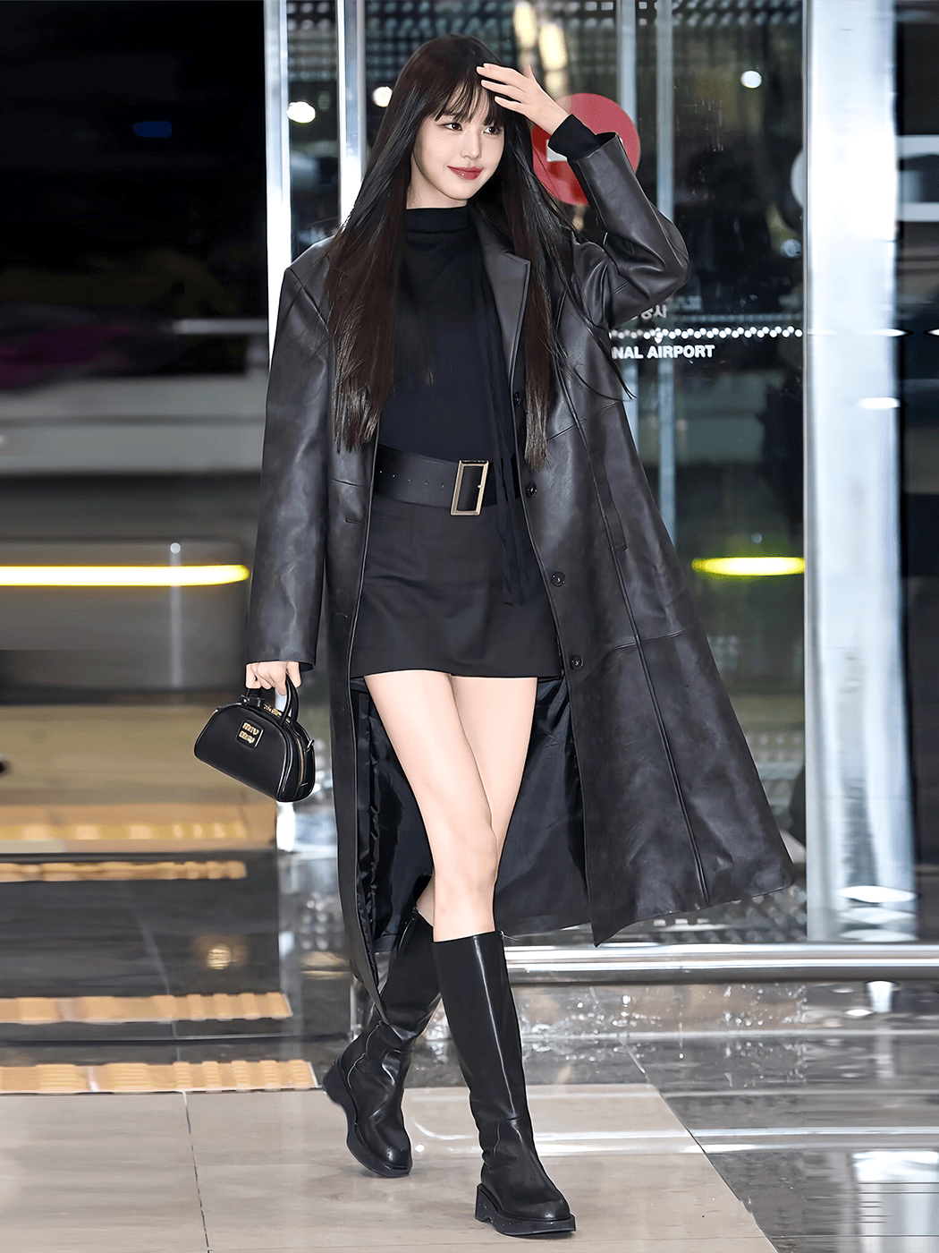 但這種款式確實不日常,想嚐試皮風衣,最好還是選擇像女團 LE SSERAFIM 日籍成員中村一葉這種,黑色、長度在小腿肚左右的款式入手。▼