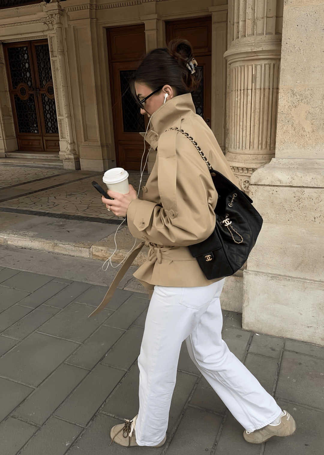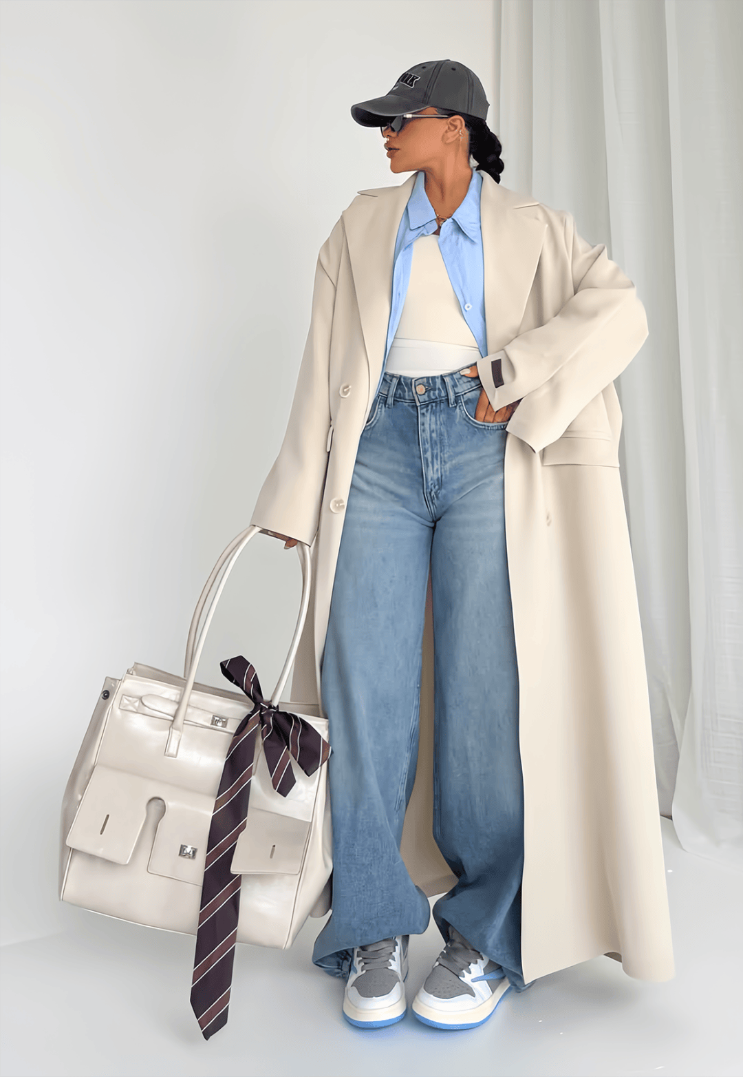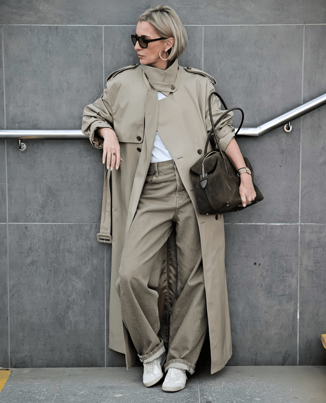 想要法式休閑感,換件針織衫或 T 恤,配條闊腿牛仔褲就行,注意別再穿緊腿褲了,“上鬆下也鬆”才能突出長款風衣的瀟灑感;