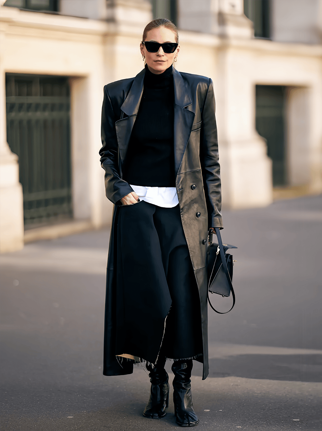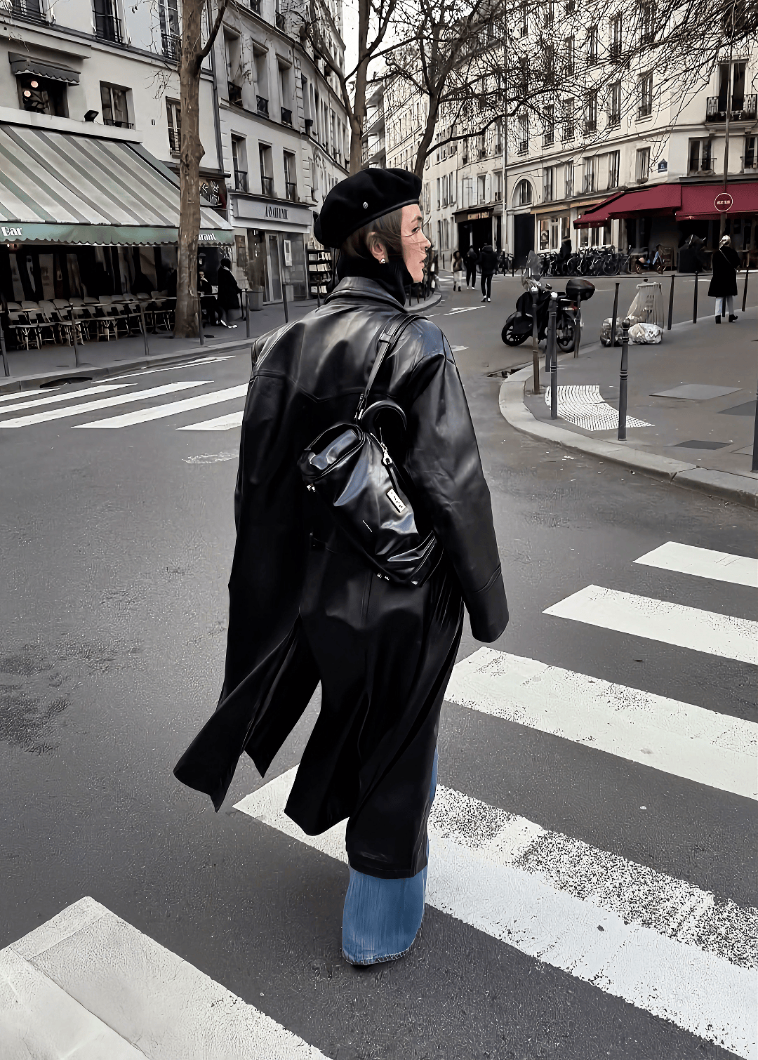 這件屬於衣櫃裏“鎮場子”的款式,存在感超強。皮質的光澤感讓風衣瞬間有了重量,一件就能撐起整身造型,穿上自帶不好惹的氣場。