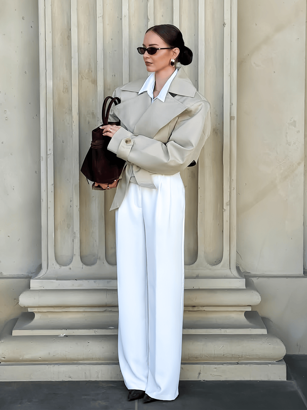 搭配褲裝時,首選小白褲,這套組合也是日常最實穿的。卡其色和白色搭在一起清爽又高級,非常適合春天穿。