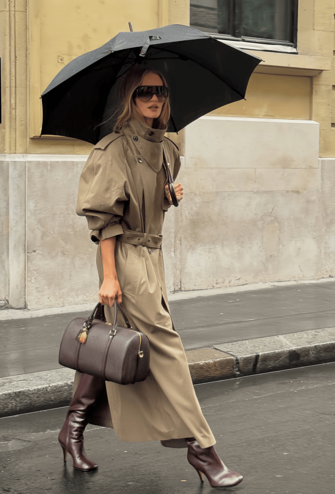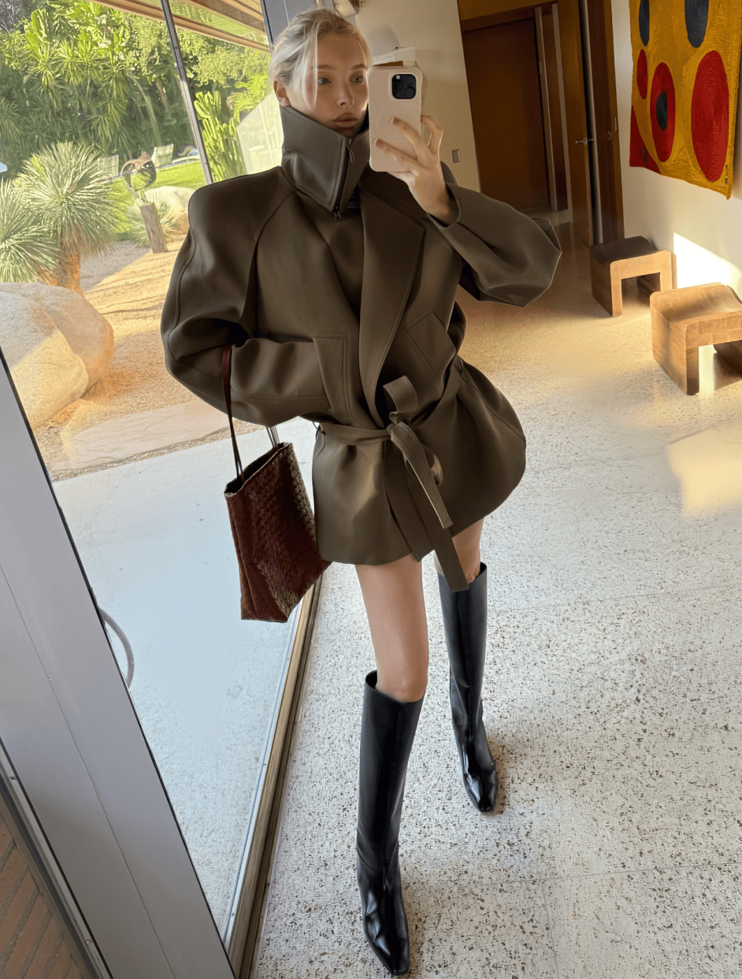 想更颯一點,可以搭配及膝長靴,煙囪領的挺拔感配上長靴,氣場翻倍。
