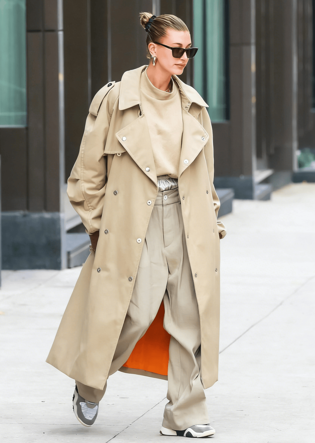 現在最夯的“經典款”,是長度在膝蓋以下、廓形偏寬鬆的款式,穿起來更慵懶隨性,比如 Hailey Bieber 這件。▼