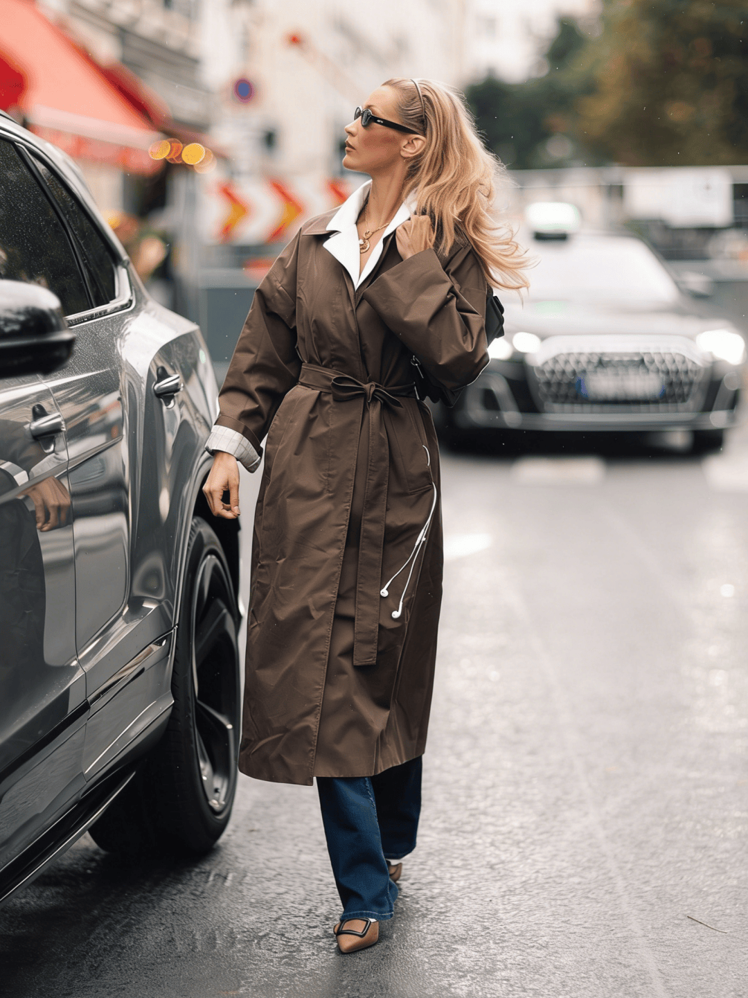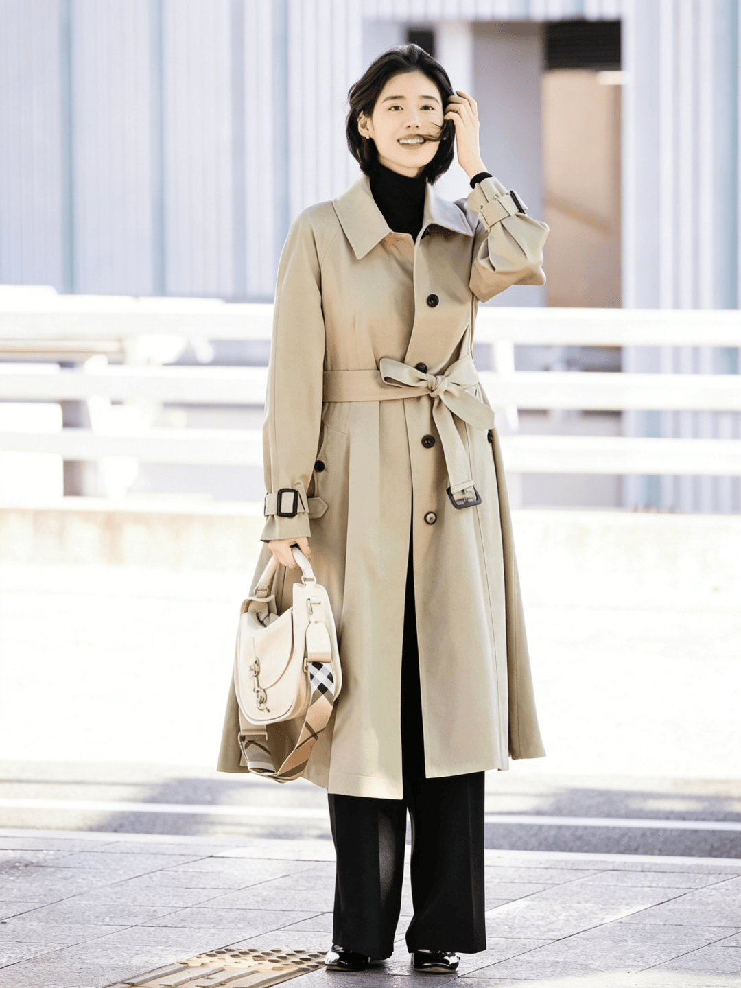這類風衣的長度通常在臀部上下,係帶一收,比例就出來了。