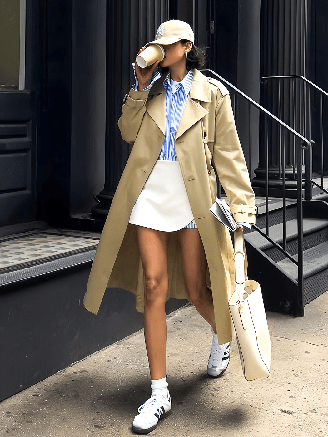 或者把搭配細節稍微換一換,加入薄底運動鞋、棒球帽、衛衣這些帶有運動感的單品,中和風衣的正式感,讓搭配更有活力。