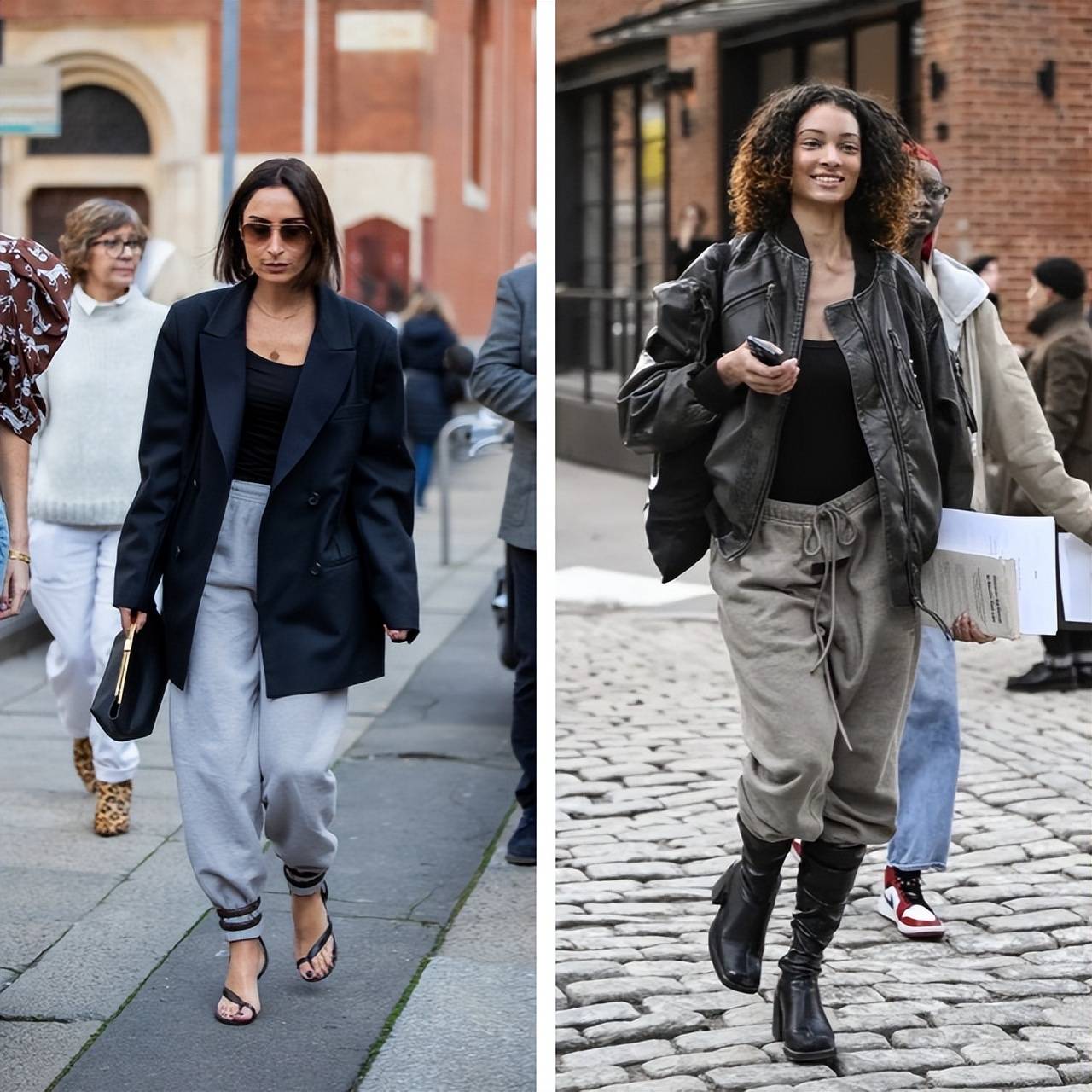在衛褲的休閑感中,加入皮夾克和長靴增添硬朗韻味。將衛衣與厚重材質相結合,能讓穿搭更具層次感。