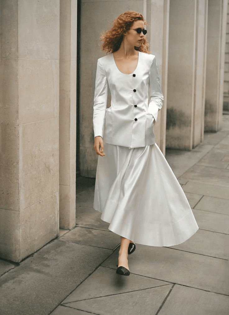核心在於版型,肩線、腰線、褲長都要剛好合身,不大不小。無需任何logo,剪裁與麵料的質感自己會說話。投資一條白色亞麻裙和一件白色亞麻襯衫,整個夏天的清爽基調便有了支撐。