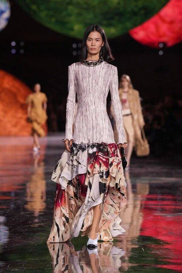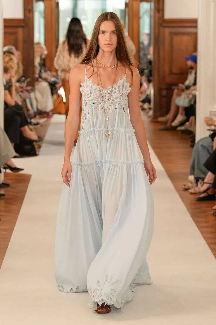 蕾絲、真絲、薄透而帶細膩光澤的麵料,幻化成溫柔的女性單品。秀場上連衣裙輕輕飄動,美得安靜而不張揚,靠的是麵料本身的質感說話。