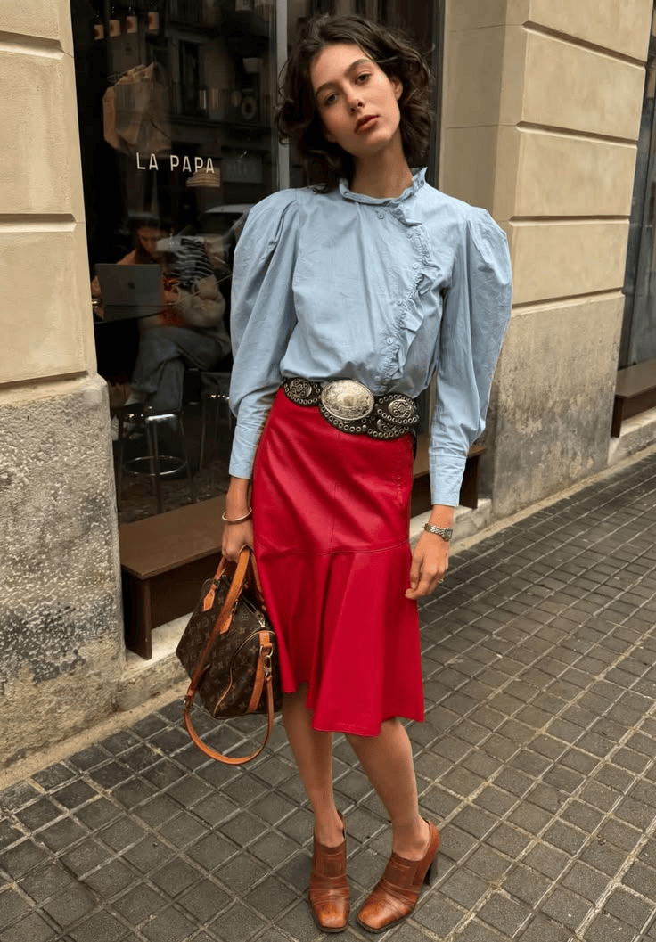 裙子本身已有足夠存在感,純色、修身、無圖案的上衣才能讓裙子成為視覺焦點。