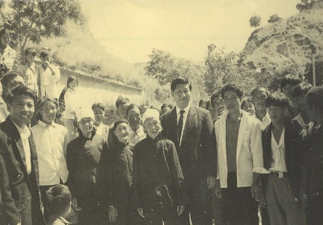 1993年,習近平回到陝西省延川縣文安驛公社梁家河大隊看望鄉親們並合影。