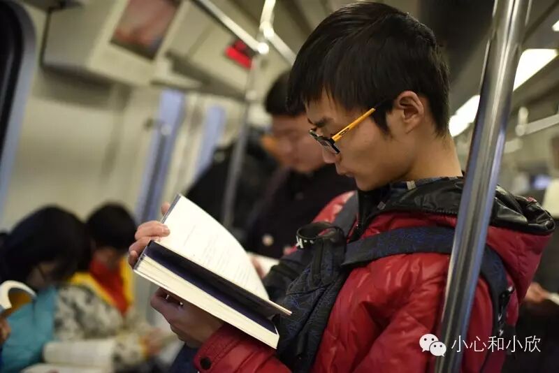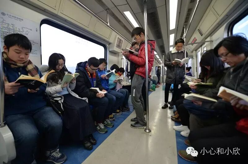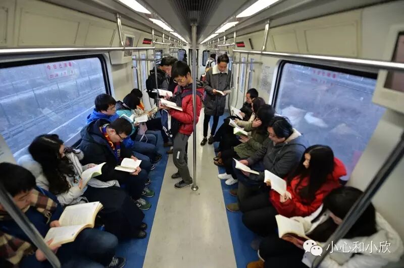 一整個車廂的乘客都在閱讀,手捧著的是紙質書,而不是手機。
