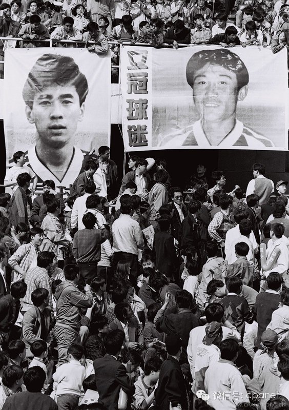 1995年,北京球迷在賽場打出國安隊曹限東、高峰等球星畫像。彼時,北京甲A球市第一次火爆。圖:胡金喜