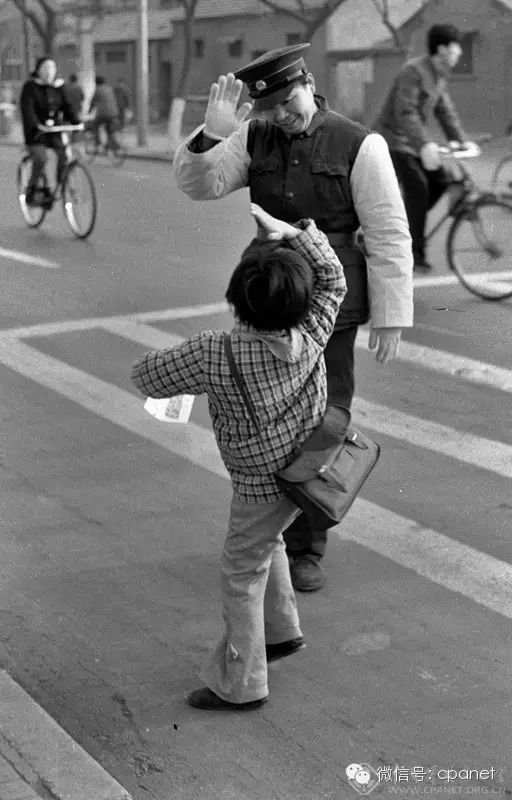 1981年,西四街頭,交警護送小學生過馬路。圖:張兆增