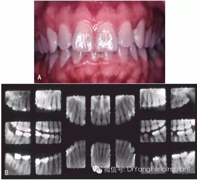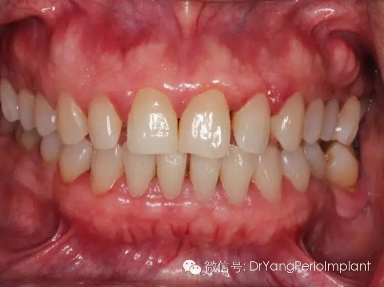 圖片顯示牙齦炎症,臨床檢查未發現臨床附著丟失,X光未見骨吸收。圖片顯示明顯的菌斑牙石,牙齦紅腫)。(圖片取自Carranza Clinical Periodontology 2012, 第11版)