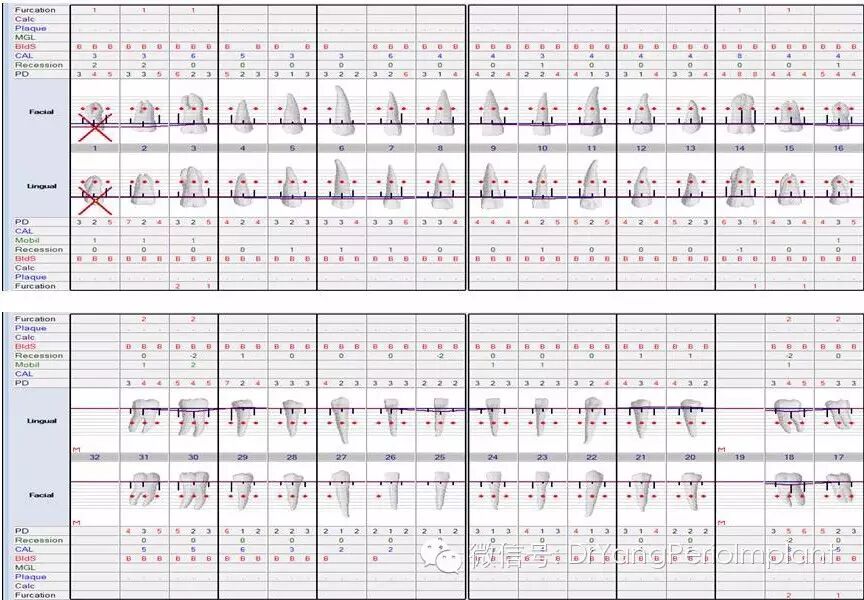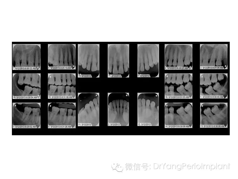 慢性牙周病一例。照片,臨床檢查,X光取自筆者治療過的患者。中年女性,長期沒有正規口腔檢查治療。照片顯示明顯的炎症,臨床檢查顯示附著丟失, X光顯示牙槽骨吸收。