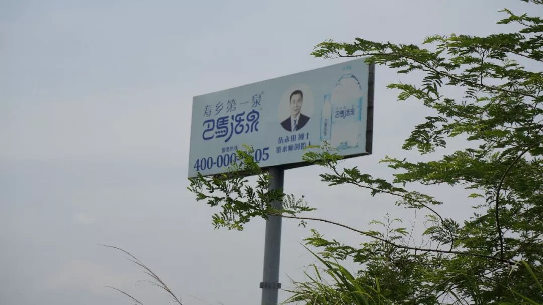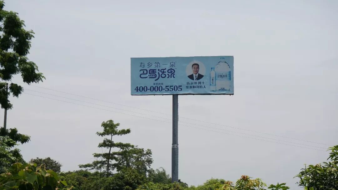 停車,因為在巴馬啤酒的對麵,另一塊高炮廣告牌上看到了故人的照片——巴馬活泉的創始人伍永田博士。