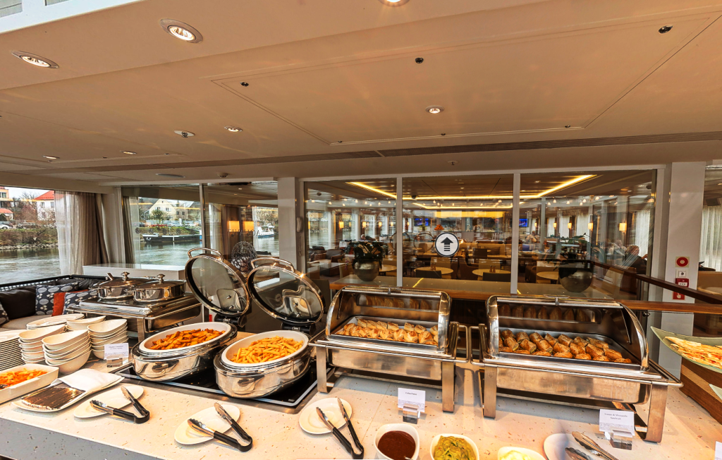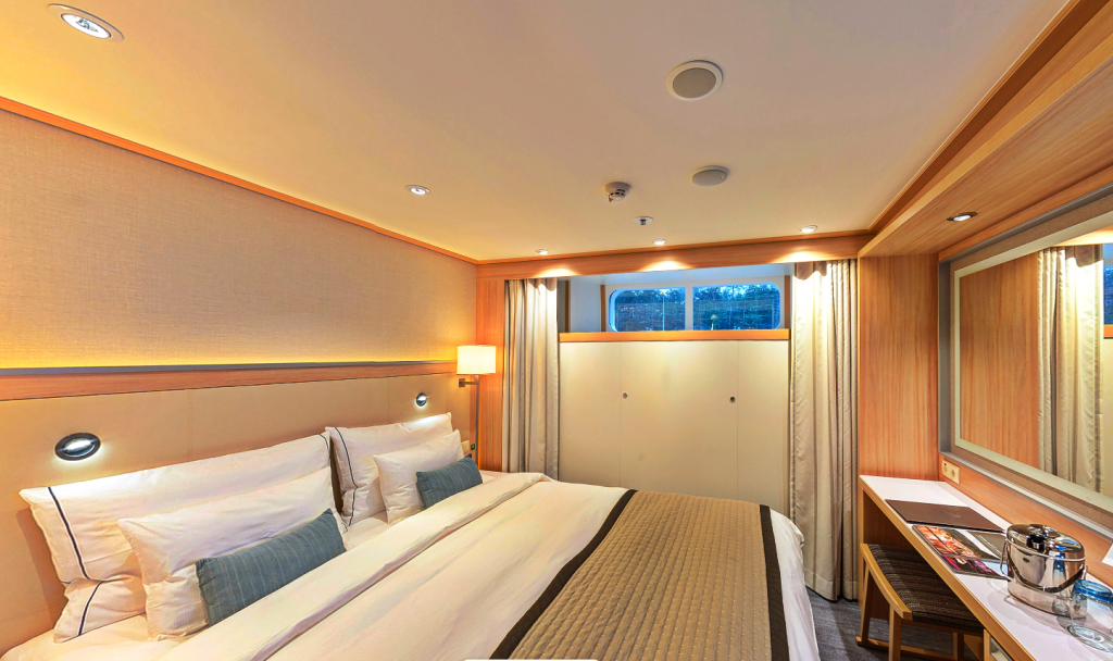 洛芙恩號建於2015年,船長443英尺,僅接待190位賓客,配備53名船員,比例之高令人安心。價格乍看不菲:標準客艙約8000美元/每人,陽台客艙約12000美元/每人,但費用已包含美國境內往返歐洲的機票、全程免費Wi-Fi、每日三次點餐式用餐與酒水,以及每天一次免費上岸遊覽。仔細算來,性價比反而突出。尤其是標準客艙,對我們來說已綽綽有餘——白天大多在岸上行走或在甲板觀景,艙位更像一間安靜舒適的旅館。