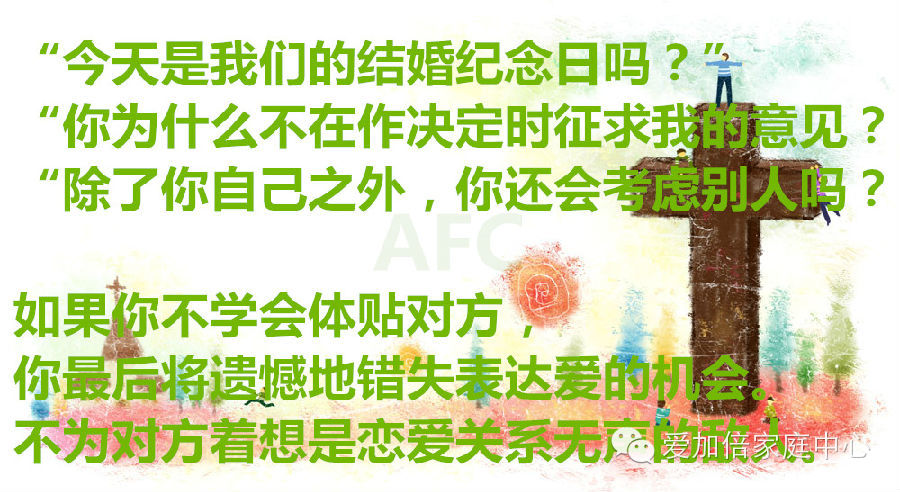 但對大多數夫妻來說,結婚之後事情就開始產生變化。妻子終於得到了她的男人,丈夫則得到了戰利品。狩獵結束,追逐終止。浪漫的火花慢慢燃成灰燼,而思念的熱情也冷卻下來。你轉而關心起你的工作、你的朋友、你的問題、你的個人需求與你自己。不久之後,你開始無意識地忽略伴侶的需要。