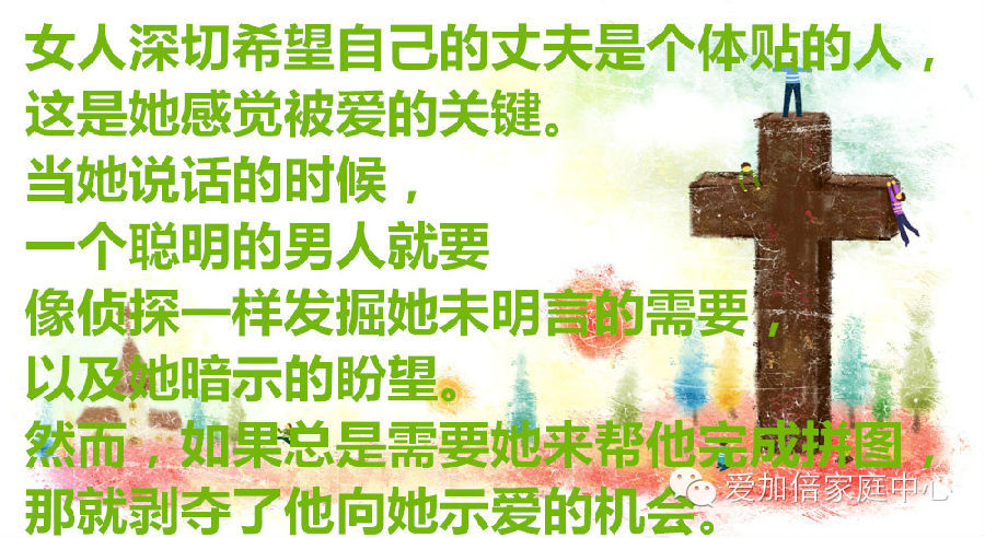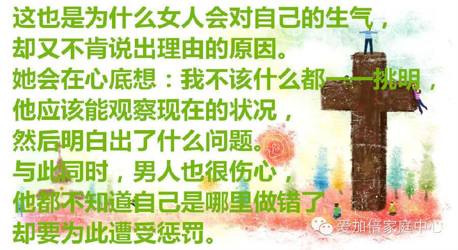 如果夫妻不明白彼此在這一點上的差異,就會導致無休止的爭吵。他深感挫敗,因為她總是愛猜謎語卻不肯直言相告;她深受打擊,不明白他為什麽不肯顧及他人感受,不懂得一加一就是二。