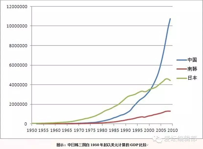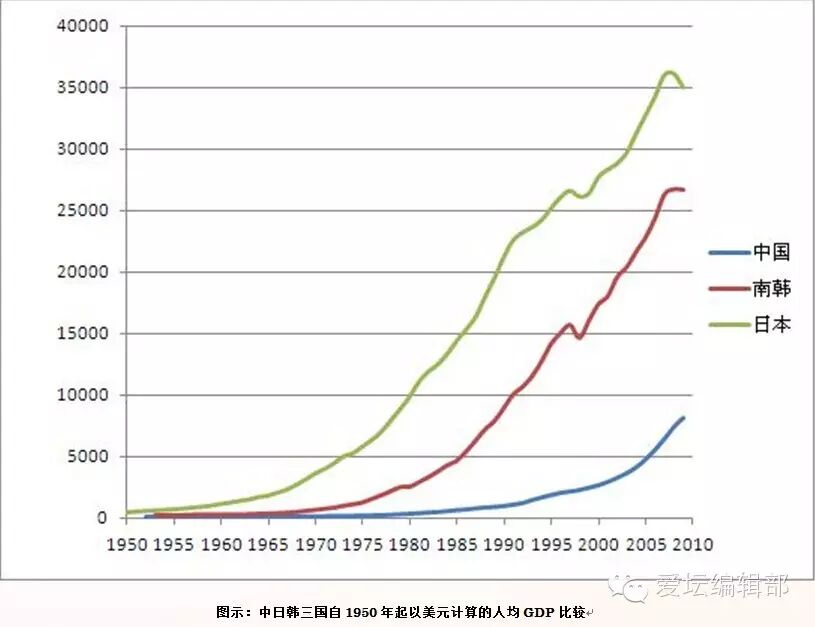 1952年可比價格的中國的人均GDP年大概是37美元;日本大概是458美元;南韓大概是243美元。中國和日本韓國的經濟競爭力(人均勞動生產率)的差距不過數百美元。而現在,中國人均GDP是8000美元,日本人均GDP比中國高27000美元,而韓國比中國高16000美元,即使考慮通貨膨脹的因素(按5%記,保持1952年的差距話,日本應該人均才12000美元,而韓國才10000美元,而實際上他們都比這個快得多),這個絕對的差距是在變大而不是變小!