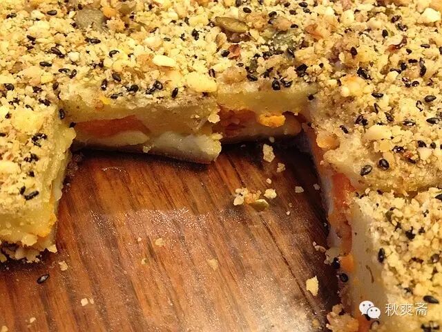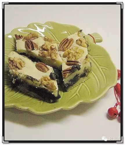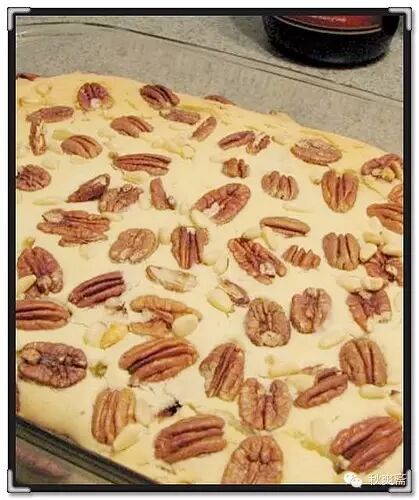 把前六種成分拌勻,放一半到9 X13 的烤盤裏,用調羹放入蓮蓉或豆沙,再放些碎核桃。然後把另一半放入烤盤,上麵撒上核桃,再撒少許椰絲。375度烤30分鍾或筷子插入不黏為止。冷後放進冰箱幾小時再切塊吃最好。