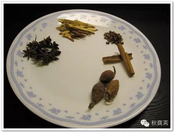 從左到右依次是:八角(不要太多,一次兩三個就夠了);甘草(也不要多,這樣的薄片三五片最多);花椒(10粒左右吧,也可以用胡椒);桂皮(一兩段吧);草果(也是一到兩顆足矣)~~~其它的如丁香,茴香,肉蔻,山奈,砂仁,白芷,辛萋~~~等等,找到就放點,找不到就將就啦:)