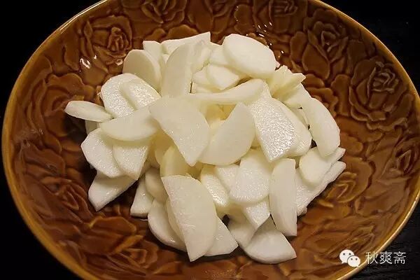 先把洗幹淨的蘿卜切成片~~~不用切太薄。加鹽抓幾下,醃30分鍾左右: