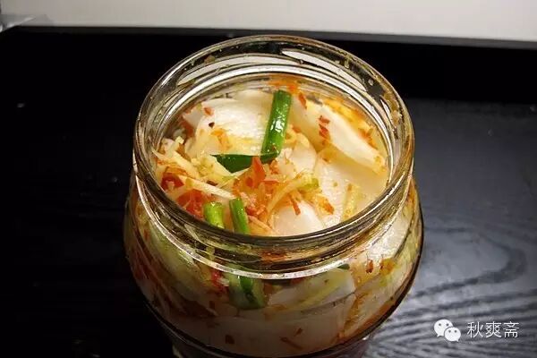 醃過的蘿卜會出些水,也不用倒出來。把配料加進去: