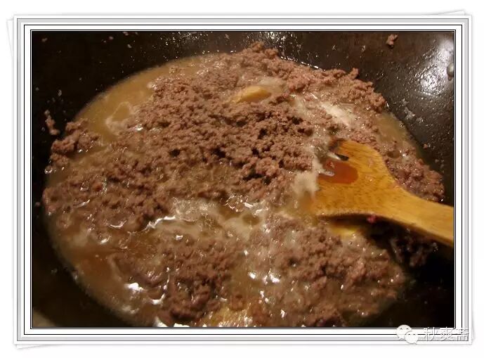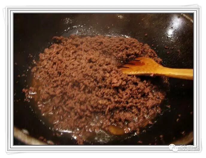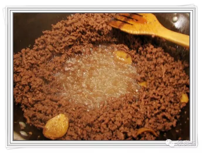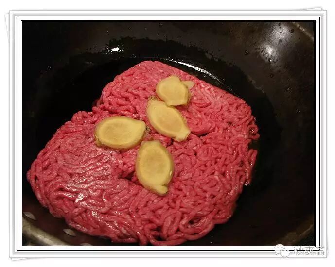 放幾片薑,料酒和醬油各半杯~~~或者自己掌握,多放點酒去腥。還可以滴幾滴醋也幫助去腥味。然後開火,這裏是關鍵:在鍋熱起來的過程中,用鍋鏟把絞肉搗散。如果你動作比較慢,就把火擰小一點,總之是趕在開鍋之前先把肉末搗散。除了料酒醬油,肉末本身也有很多水分。一邊翻炒,一邊水分就出來了,很快就像水‘煮’的啦:
