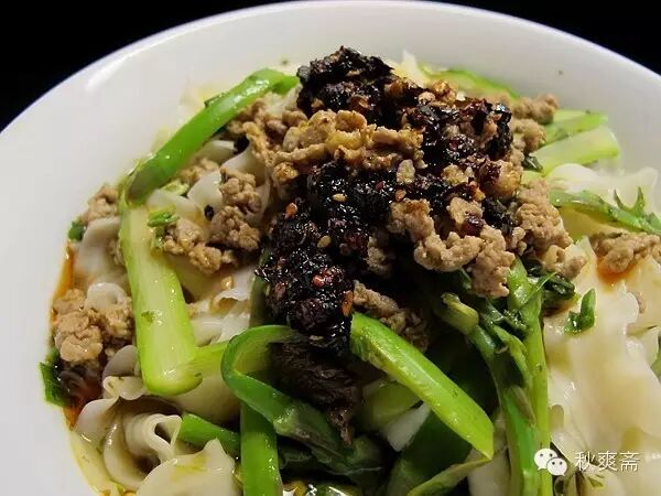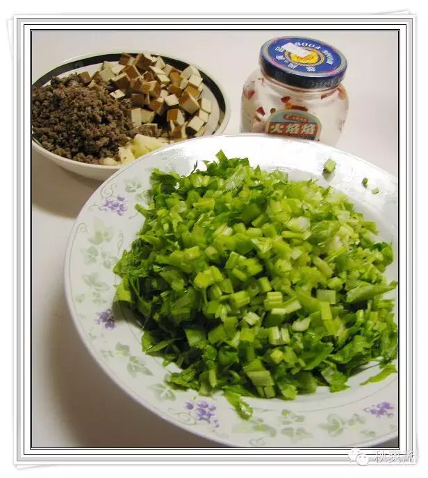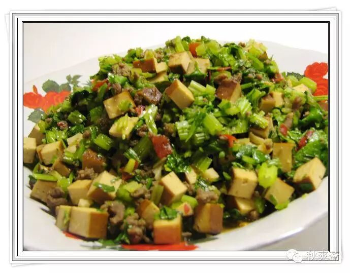 再來炒盤芹菜:東方店買的中國細芹菜,因為蠻貴,所以連葉子一起切碎。再配點豆腐幹和肉末,還加了一勺剁辣椒,一來提味,二來配色: