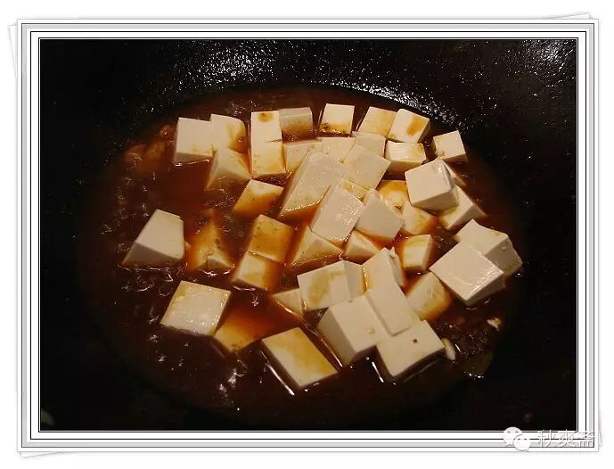 起油鍋先爆香蒜瓣,下豆瓣醬炒‘起沙’(就是冒小泡泡,一分鍾左右)。加醬油,一點點糖,喜歡雞精的可這時候加。然後加一小杯水,把切好的豆腐放進去~~~我用的日本豆腐,比較嫩,盡量少翻動。蓋上蓋煮三到五分鍾,其間可拎起鍋晃動幾次免得粘鍋: