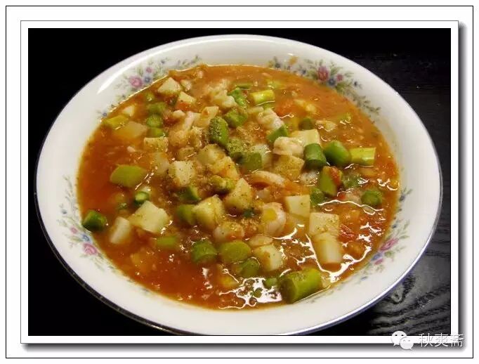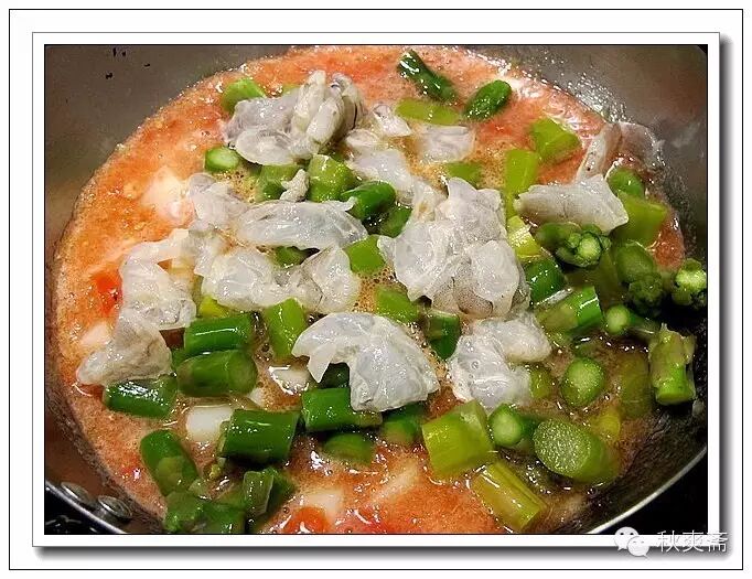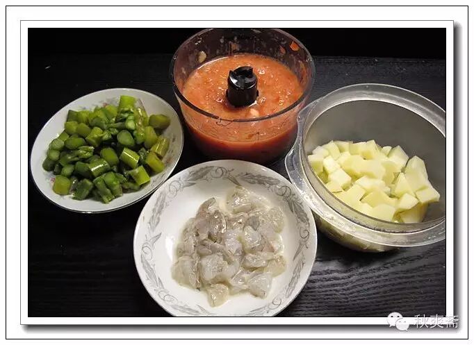 土豆切丁加一點點水,微波爐兩分鍾待用;100克的蝦(去殼)大約5到6隻,也切丁加點澱粉和鹽醃上;蘆筍是上一頓剩下的,開水燙過。你也可以直接放生的(可以用芹菜,黃瓜,西蘭花等代替);因為想做不放油的晚餐,所以就把西紅柿打碎了,然後倒入鍋裏,再把土豆也倒進去,煮開後再加蘆筍和蝦仁~~~蝦仁攤開擺在最上麵: