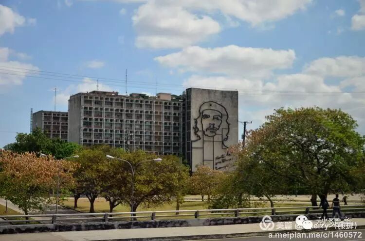 革命廣場一側的切.格瓦拉巨幅掛像 。切.格瓦拉是阿根廷的馬克思主義革命家、醫師、作家、遊擊隊隊長、軍事理論家、國際政治家及古巴革命的核心人物。
