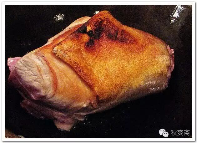 如果你看過俺的梅菜扣肉方子,這一步就用了做扣肉的第一步。用比較深的炒鍋,放一點點油(約半杯),晃均勻。然後平放肘子,蓋上蓋子大火燒一會(約3分鍾),熄火;等鍋中爆炸的聲音小下去了,再開蓋翻一麵,蓋上蓋子再大火三分鍾~~~如此重複幾次,直到各麵都炸到: