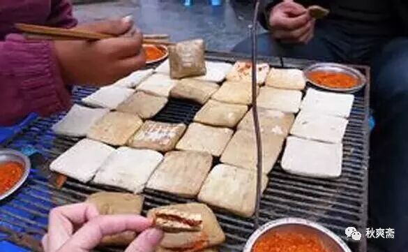 長沙的臭豆腐很出名,大一的時候興衝衝買了一大碗,顛覆世界觀的黑,吃了後很失望,想了很久覺得這臭豆腐少了一樣東西——貴州烙鍋辣椒麵,也叫五香辣椒麵。在我看來,烙鍋辣椒麵簡直是一切油炸和燒烤食品的絕配,加香料把辣椒磨得像鹽那麽精細,無論炸土豆、炸臭豆腐用力的裹上一層色澤誘人的辣椒麵,絕對化腐朽為神奇。在畢節大方縣,有一種不太出名的豆腐幹,名氣當然比不上長沙的臭豆腐,也比不上安徽的毛豆腐,但是後兩者在其麵除了臭之外毫無優勢,小凡一根扁擔,一邊一個裝滿木炭的鐵盆就是一個流動的小吃攤,鐵盆上是一個鐵絲網,整齊碼放著聲的豆腐塊,四個角每個角上一個碗,碗裏裝的即是磨得精細的辣椒麵。隨叫隨烤,蒲扇一扇,不出五分鍾,巴掌大小的臭豆腐表麵烤得金黃即可食用,下圖記錄了貴州臭豆腐與烙鍋辣椒麵的兩種吃法: