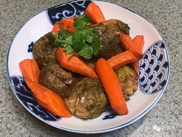 揭蓋後扔了些抱子甘藍和胡蘿卜到烤盤裏一起烤~~~賣相不好,味道還行: