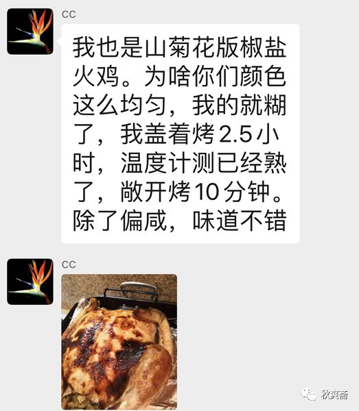 正好群裏Elaine廚友上了她家西式brine後烤的,借來對比一下~~~是不是有點像?