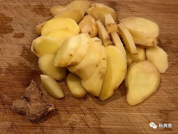空氣炸鍋工作的同時,來準備薑。我家就這麽多生薑了,貌似多一些更好。又找出一塊幹薑(左下角)。看見人家都去皮,也刮了一下,切成厚片: