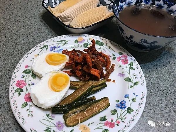早餐:苞穀粑粑,雜糧粥,鹹雞蛋,醬黃瓜,胡蘿卜鹹菜(都有做法:)
