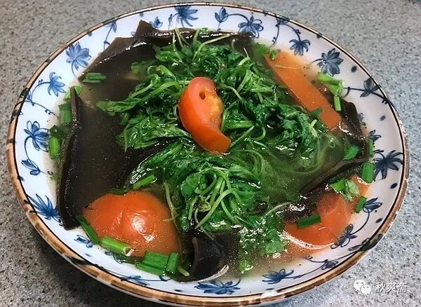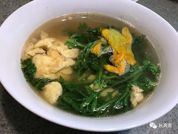 南瓜開花了,雌花還沒有出現,摘回來跟雞毛菜做伴~~~雞胸肉切片,一點點鹽和胡椒粉,水澱粉醃幾分鍾,拌入一小勺香油或你喜歡的油,入加過菜葉又滾了的湯,熄火。又嫩又健康:)