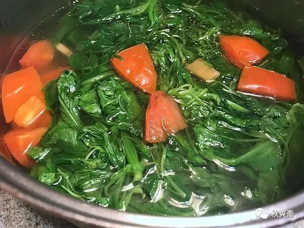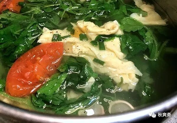 西紅柿吃完了,雞蛋煎一下,加水煮開,放入洗幹淨的菜,再一開就可以熄火了。撒點鹽,滴幾滴香油,就是一碗清香爽口的湯~~~在家上班的好處,午餐可以多一碗湯:)
