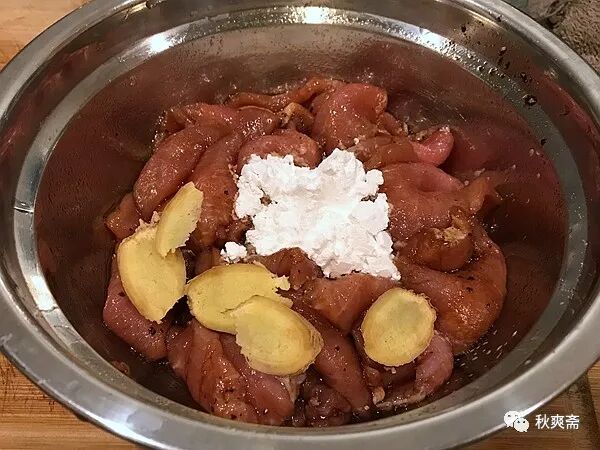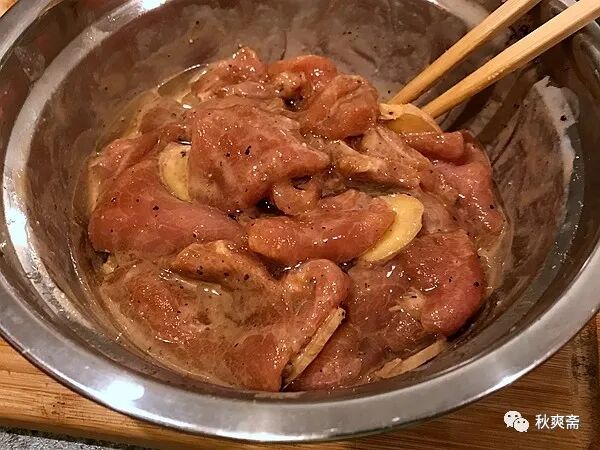 再次拌勻後,澆一勺炒菜油鎖住料汁。疫前要去單位上班,我會在晚上完成準備工作,放入冰箱,早上起來炒一下,花不了多少時間。如今在家,可以提前半小時切肉,拌好醃十來分鍾就可以了: