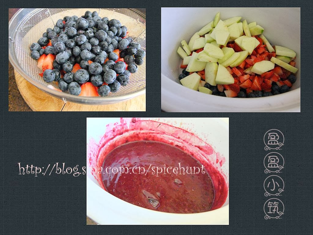 1. 把草莓去蒂和藍莓一起洗幹淨,瀝幹。把草莓切塊,和蘋果藍莓和檸檬汁一起放入慢燉鍋裏加蓋燉15-20分鍾,或至所有水果變軟。
