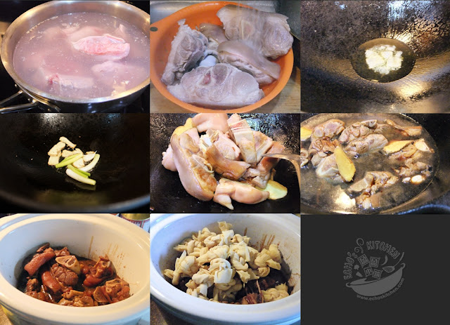 1. 把豬蹄拔毛洗幹淨,入滾水汆燙,然後洗淨備用。