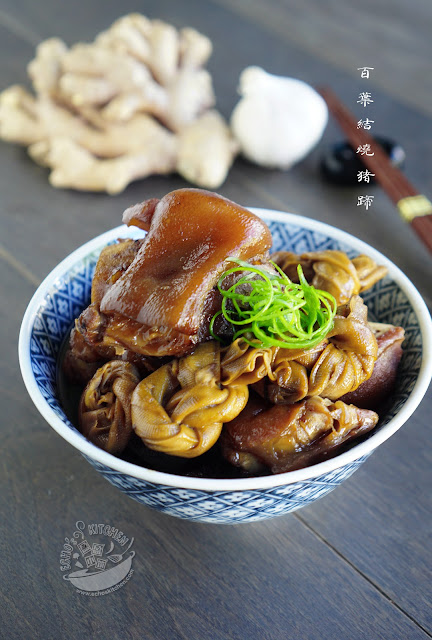 買了兩隻豬蹄燉燙喝,燉了兩次就有點膩了,換個口味做紅燒吃吧!剛好家裏有包百葉結,加入一起燒,吸了湯汁的百葉結更好吃哦!