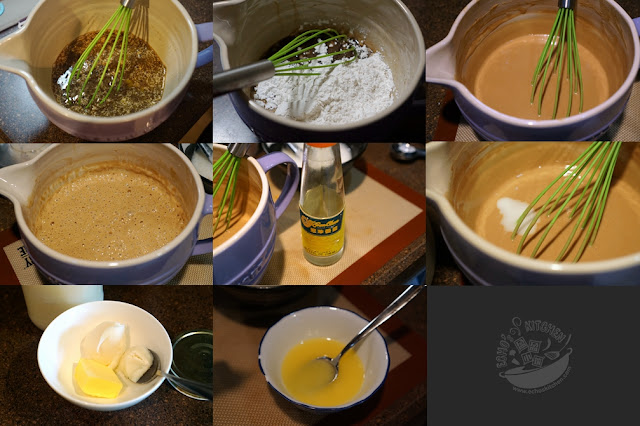 6. 把牛油和豬油隔水或微波爐裏加熱融化後倒入麵糊裏攪拌勻。