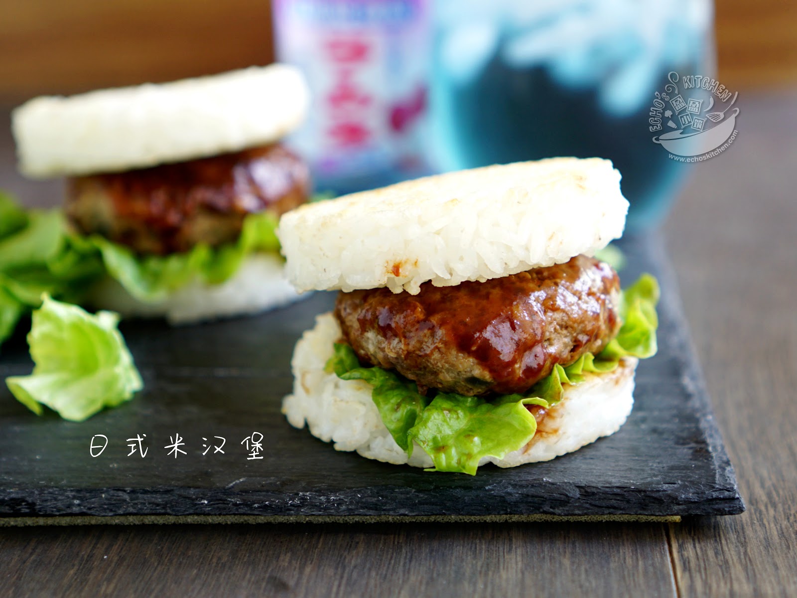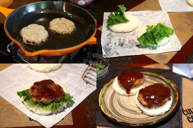12. 把漢堡肉煎好,擺到生菜和飯團上,淋上醬汁組裝成漢堡即可開吃!一個肯定不夠的哦!