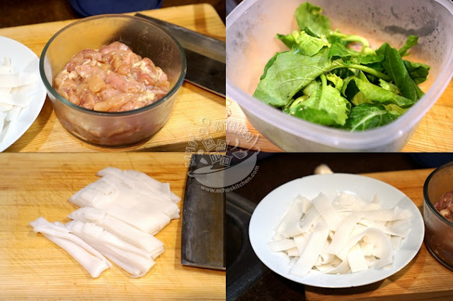 1. 把材料都準備好,芥蘭洗淨切段,肉切片用一點料酒,醬油,胡椒粉和食鹽醃好。粿條用手掰開,這樣炒的時候才容易炒散。