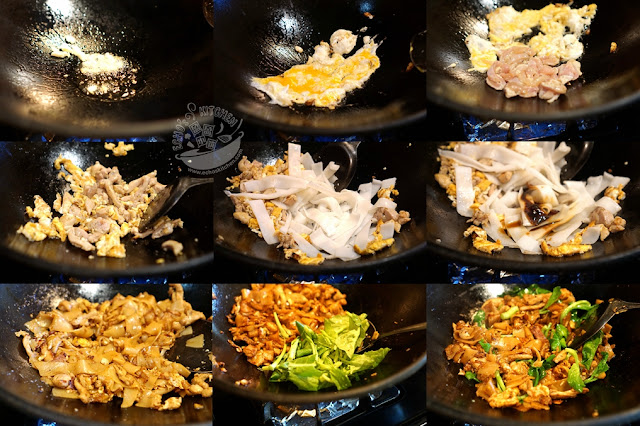 4. 熱上一口鍋,加入豬油和豬油渣和1小勺的蒜蓉,大火炒香之後加打入一隻雞蛋炒散後加入肉片炒至變色之後加入粿條,大火炒散,加入1大勺的醬汁快炒1 分鍾左右。