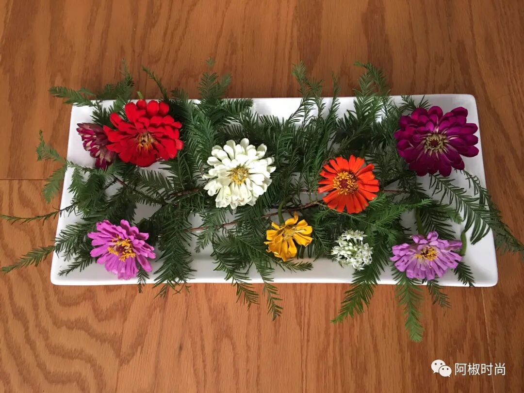 越來越喜歡用淺盤擺放院子裏采的鮮花,換水容易,不用挪動花花,擺置也比瓶花容易,不需要使用固定花枝的綠海綿或者插花針座。簡單方便。天門冬枝條做盤花襯葉絕佳[強],鬆柏枝也很好。